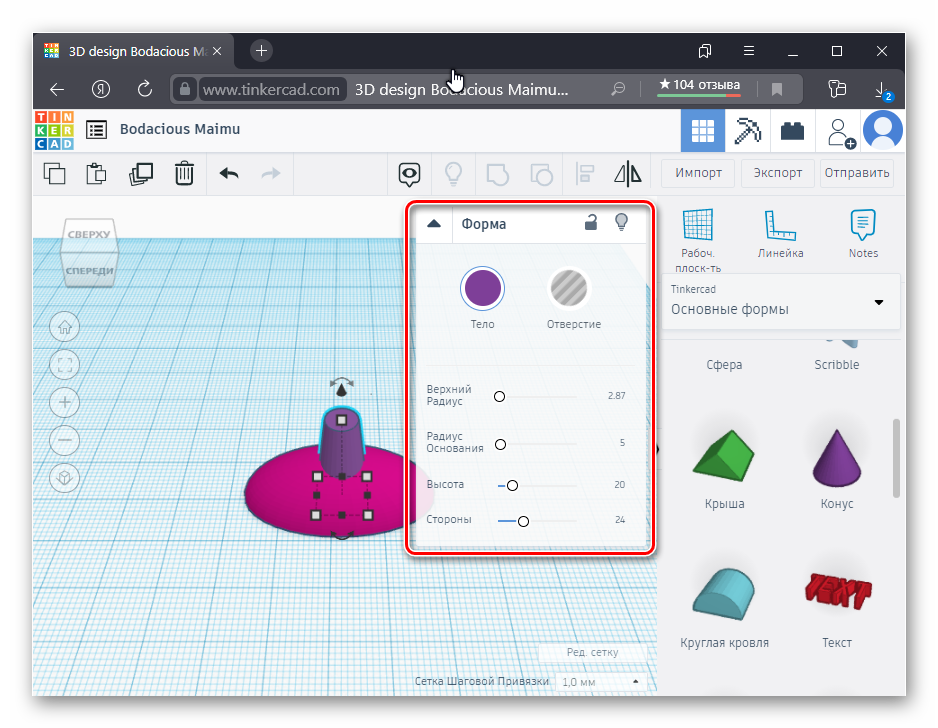 В TinkerCAD можно делать детальки для конструктора и прочую мелочевку, но со сложными конструкциями редактор уже не справится. Большой плюс в том, что программа позволяет сначала создать фигуру в 2D и преобразовать ее в 3D-объект. Единственный минус – русский язык не поддерживается, но интерфейс и так предельно понятный.