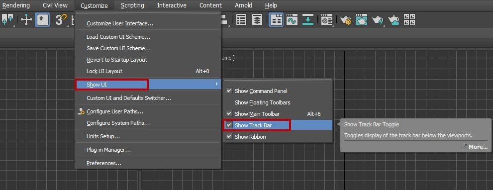 Если, к примеру, вы работаете не на большом мониторе, а на ноутбуке, то эта панель может существенно уменьшать полезное рабочее пространство. Чтобы её спрятать, перейдите в главное меню выберите пункт Customize — Show UI и снимите флажок с пункта Show Track Bar.