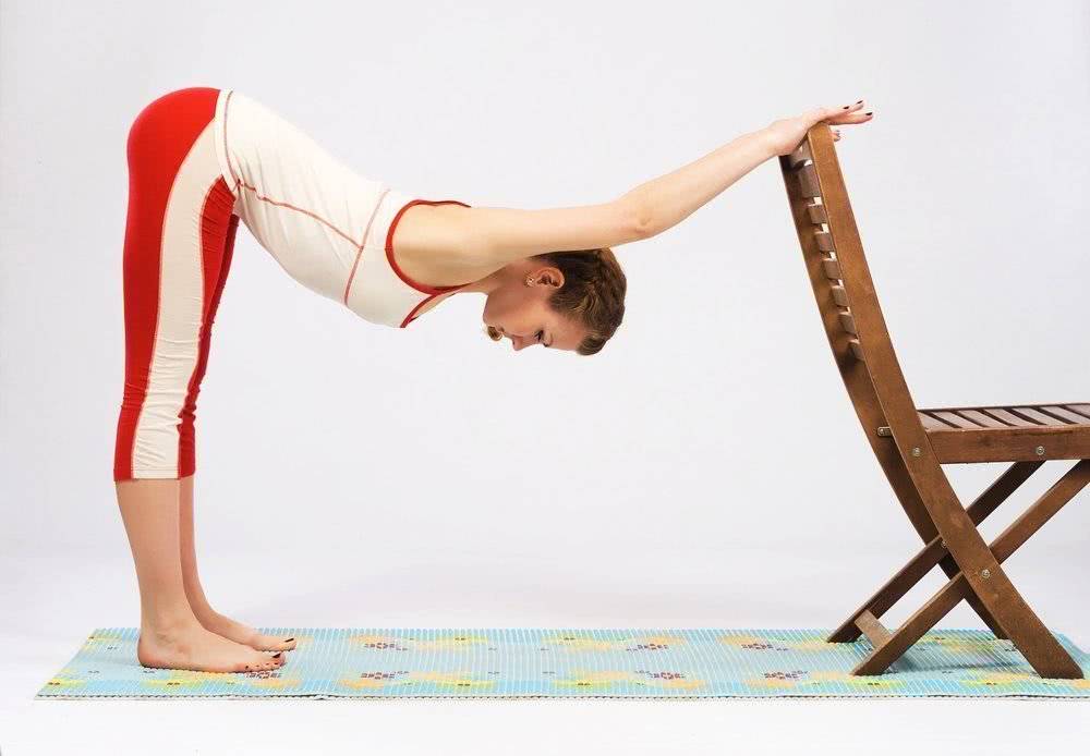 - С выдохом отводите ноги в стороны, упираясь в ножки стула.