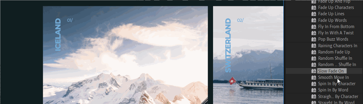 Выберите текстовый слой Iceland и перейдите на панель Effects & Presets, найдите эффект Slow Fade On в списке Animation Presets — Text. Перенесите этот эффект мышкой на текстовый слой.