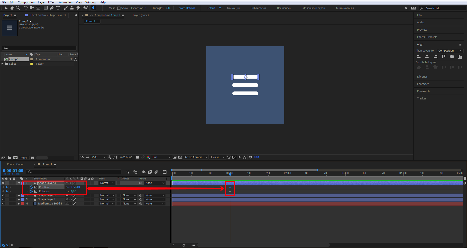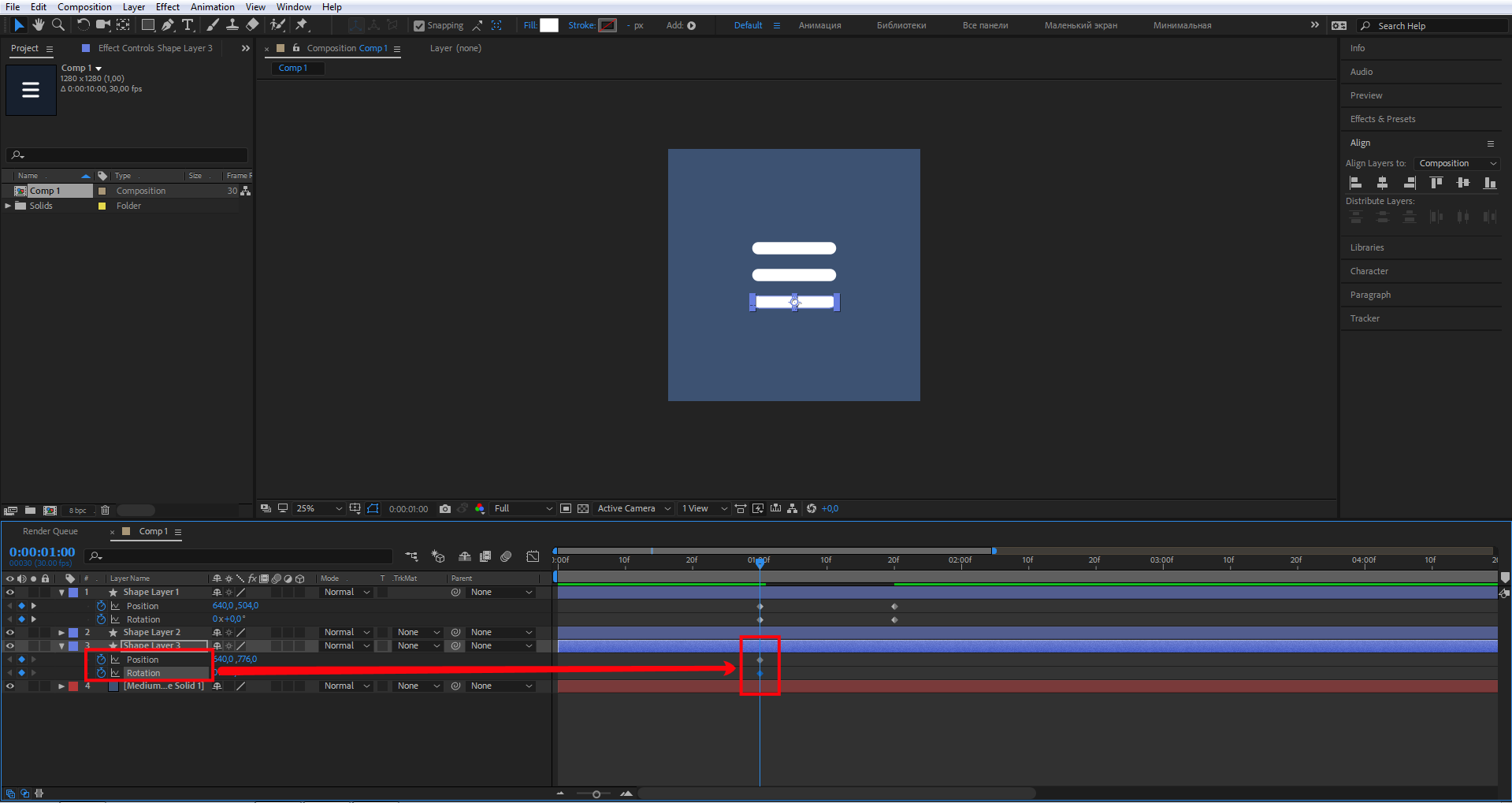 Активируйте свойства слоя нижнего прямоугольника — зажмите Shift, затем поочередно P и R для отображения свойств слоев Position и Rotation. На панели Timeline переместите индикатор на первую секунду. Кликните на иконки секундомеров, тем самым создав ключевые кадры для свойств слоев Position и Rotation.