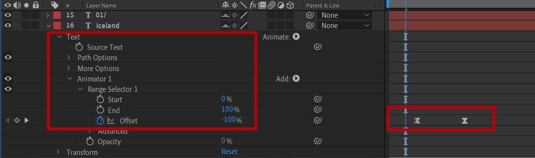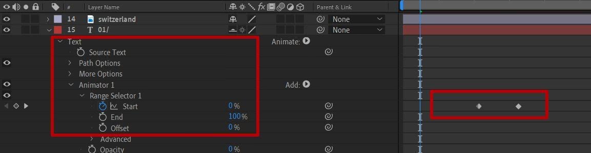 Следующим шагом нужно настроить ключевые кадры этого слоя так, чтобы текст появлялся вместе с фотографией. Для этого перейдите в свойства этого слоя, выберите Text — Animator 1 — Range Selector 1 и перенесите первый ключевик на двенадцатый кадр, а второй — на третий кадр второй секунды.