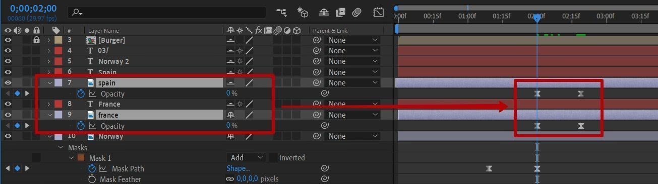 Выделите слой среднего прямоугольника и нажмите T, вы увидите свойство Opacity. Создайте ключевые кадры, для первого задайте значение прозрачности 100%, для второго 0%.