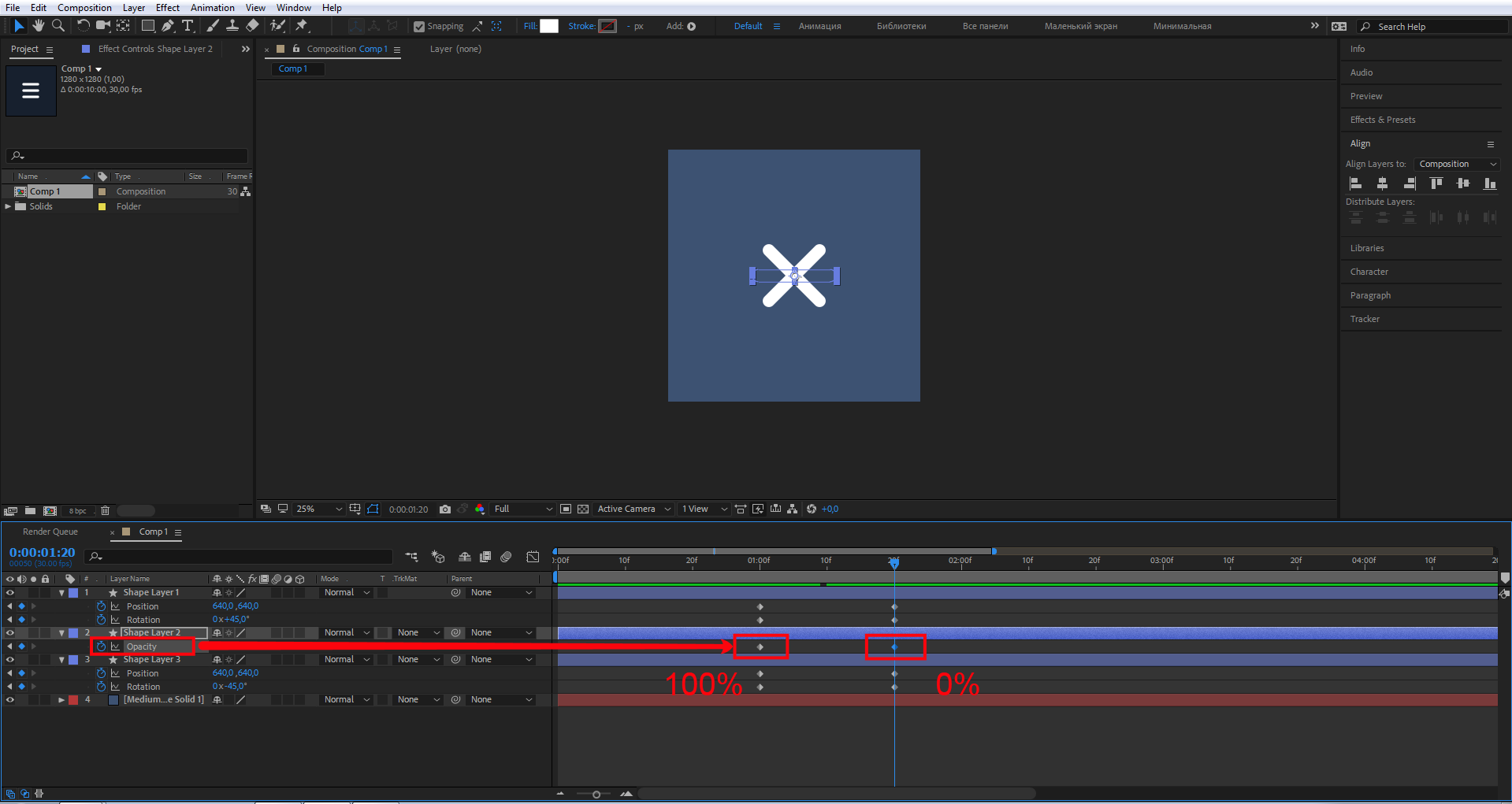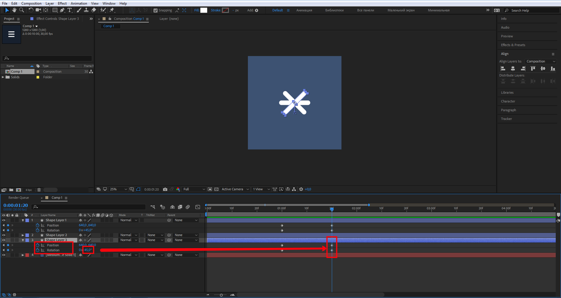 Переместите индикатор и создайте новые ключевые кадры, как на скриншоте, для свойства Rotation задайте значение –45°. Находясь на свойстве Position, переместите прямоугольник к центру двух других прямоугольников.