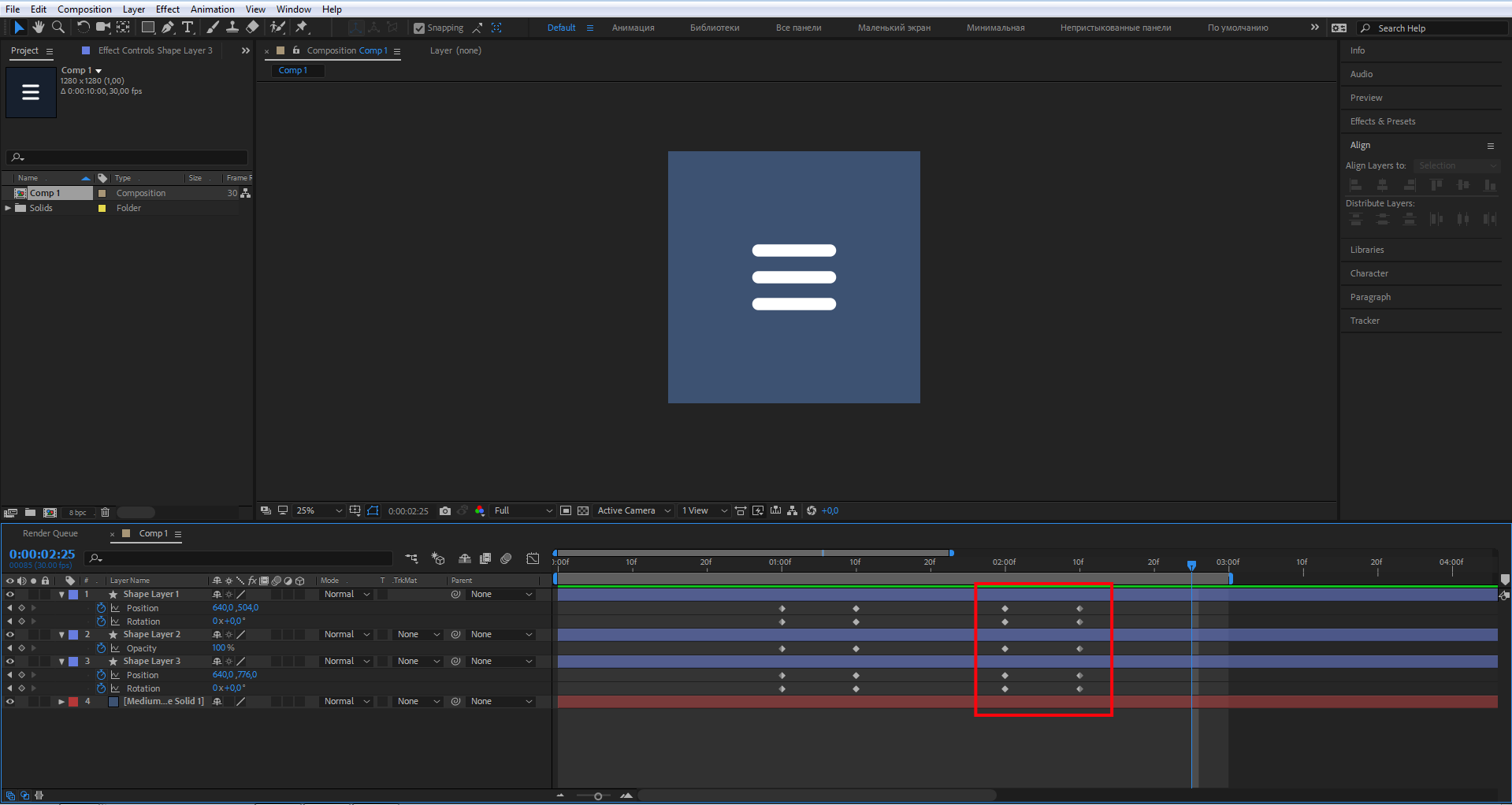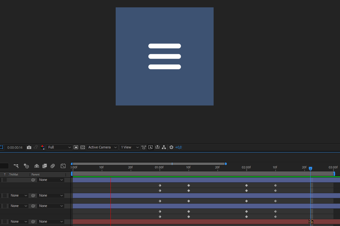 Выберите верхний прямоугольник и на панели Timeline выделите ключевые кадры свойств Position и Rotation, нажмите Ctrl + C. Затем переместите индикатор, как показано на скриншоте, и нажмите Ctrl + V. Тем самым вы скопировали ключевые кадры и свойства этого элемента. Но ключевые кадры еще раз продублируют анимацию от бургер-меню к элементу закрытия. Нам нужно ровно наоборот, чтобы элемент закрытия превращался обратно в бургер-меню.