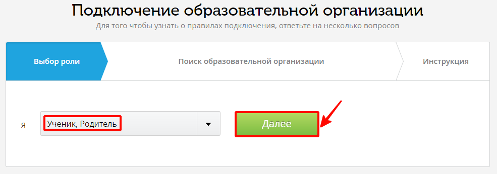 На открывшейся странице выберите, в качестве кого вы регистрируетесь в личном кабинете: ученик/родитель или учитель/сотрудник. Нажмите “Далее”.