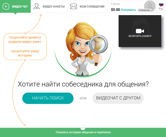 - Моментальный поиск собеседника. Как только вы окажетесь на главной странице, система сразу же включит камеру.