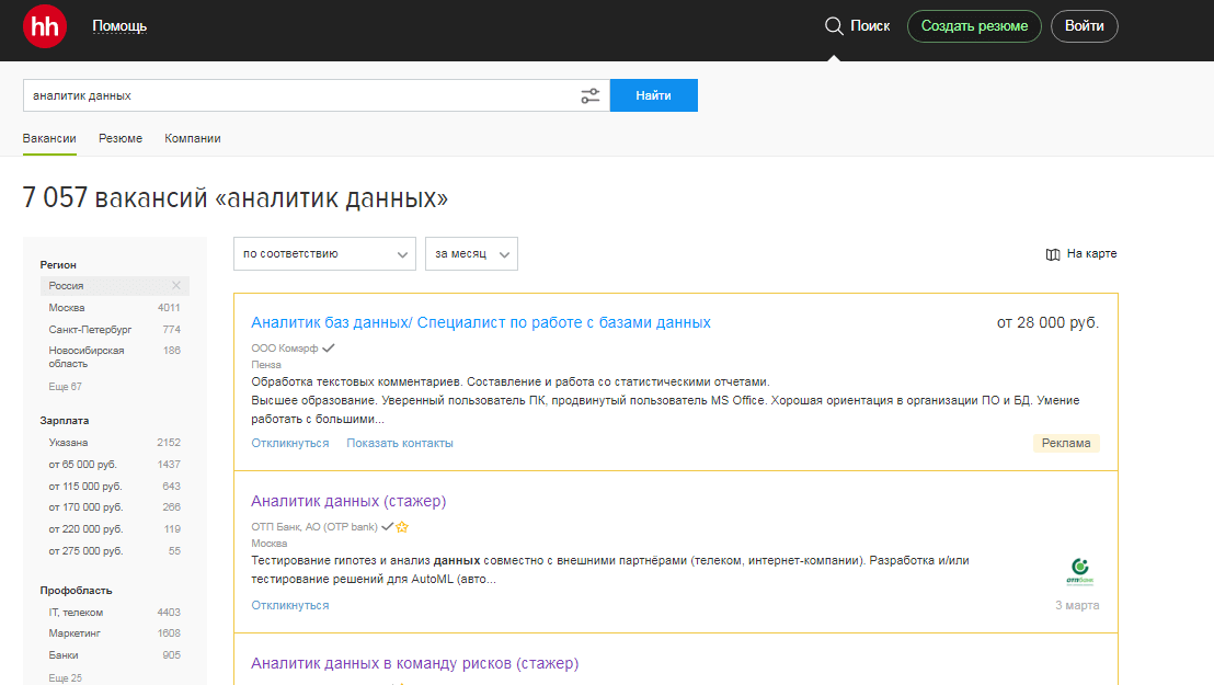 Аналитики данных требуются в маркетинге, банках, IT/Телекоме и еще 25 профобластях. Есть вакансии с разным графиком работы и типом занятости (в том числе для проектной работы и стажировки). Можно найти работу в других европейских странах и США (с дальнейшим переездом).