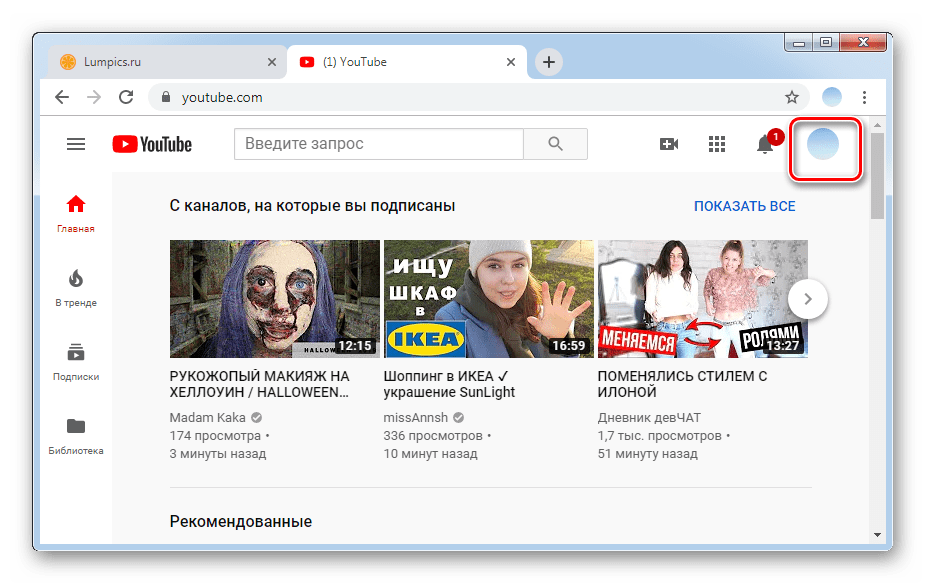 В правом верхнем углу вы найдете свой аватар. Если у вас нет установленного аватара, вместо него появляется кружок с первой буквой вашего имени. Нажимаем на него.
