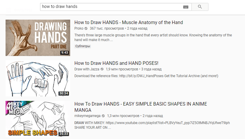 Но если написать “how to draw hands”, в результатах будут видео на английском.
