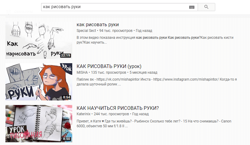 Чтобы найти на YouTube видео на английском, просто вводите поисковые запросы на английском. Например, вы увлекаетесь рисованием и хотите найти видео о том, как рисовать руки (кто рисует, поймет). Если написать “как рисовать руки”, увидите ролики на русском.