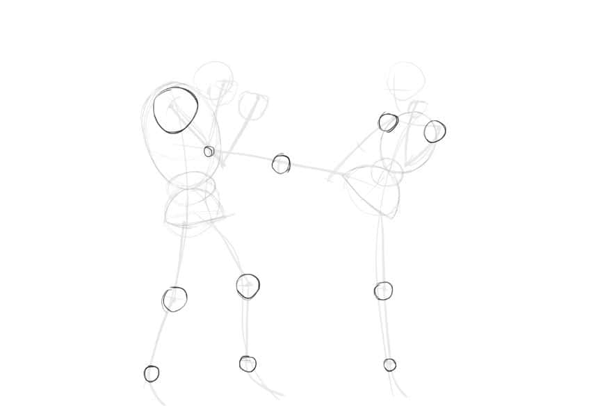 Теперь перейдем к практике. Для начала рисуем туловище. Внимательно подгоните перспективу под позы бойцов. В аниме такие динамические позы редко рисуют в обычном виде спереди или сбоку.