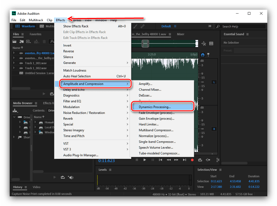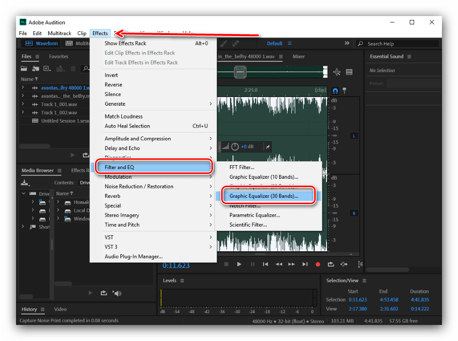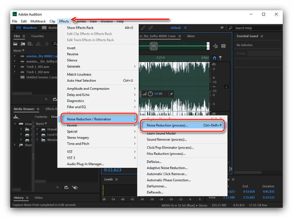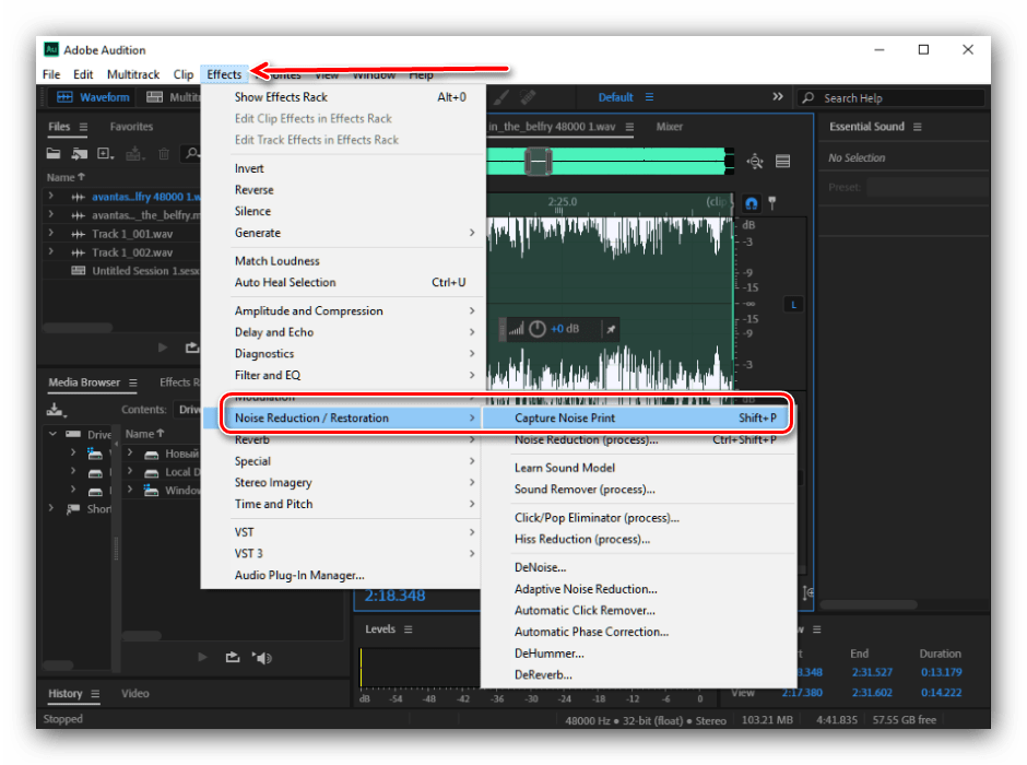 - Нажимаем на ней два раза левой кнопкой мышки (ЛКМ) для открытия в удобном окне для редактирования. Теперь удалим шумы. Для этого выделяем необходимую область, на верхней панели жмем «Effects» — «Noise Reduсtion» — «Capture Noise Print». Этот инструмент применяется в случаях, когда шум нужно убрать в отдельных частях композиции.