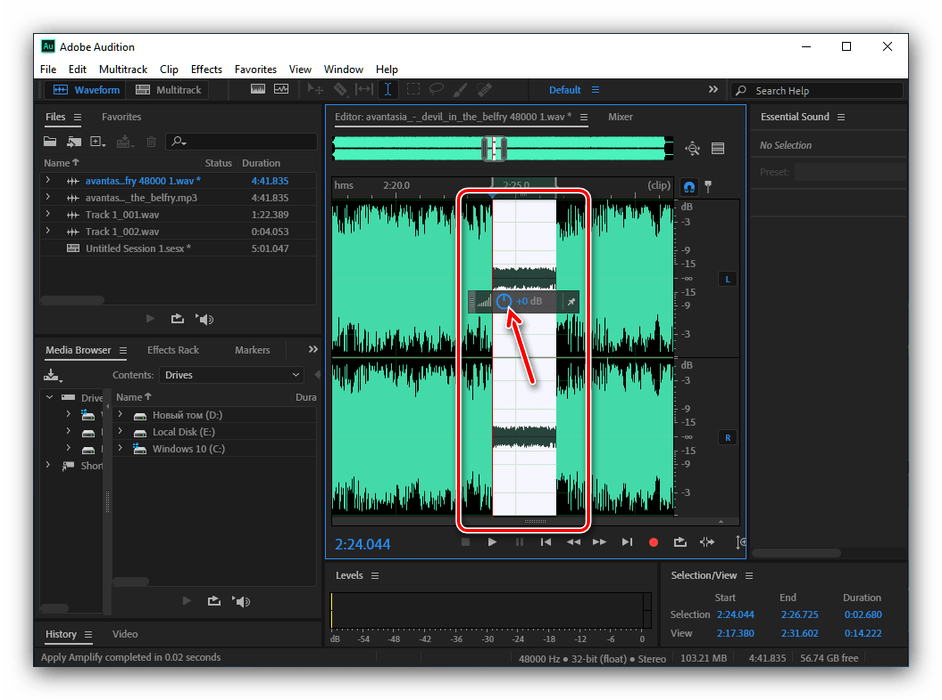 В Adobe Audition СС 2014 можно последовательно выделить каждый шум, а также звуковые потоки из цельного произведения, чтобы сформировать самостоятельные дорожки. Благодаря этой функции, можно разобрать даже самые тихие звуки, вычленить их из файла, а затем заняться обработкой.