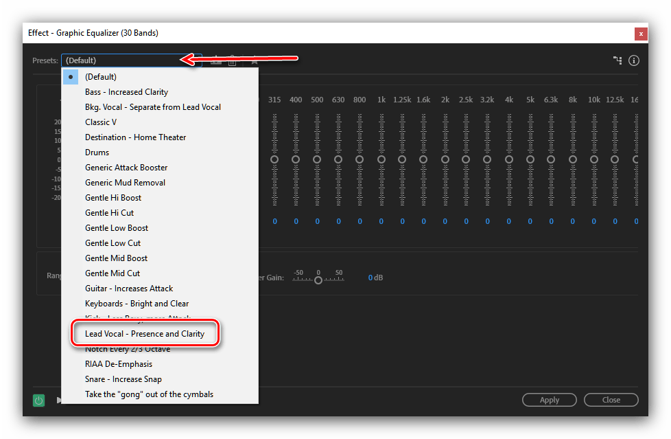 Появляется эквалайзер. В верхней части выбираем «Lead Vocal — Presence and Clarity». Со всеми остальными настройками необходимо экспериментировать. Все зависит от качества вашей записи. После того как настройки выполнены, жмем «Apply».