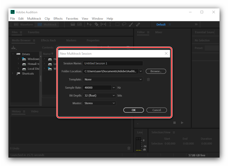 - Чтобы добавить проект, нажимаем на вкладку «Multitrack» и создаем новую сессию.