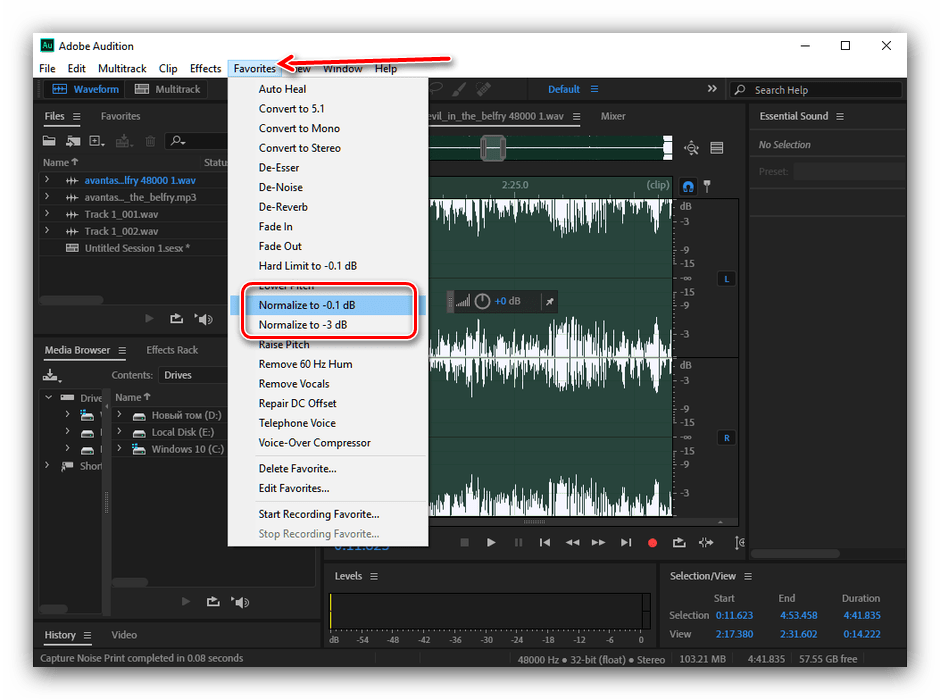 Для увеличения громкости до максимального предела идем в «Favorites» — «Normalize to -0,1 dB» либо «Normalize to -3 dB»