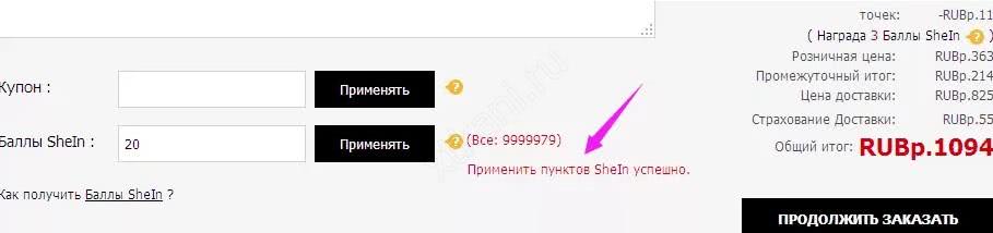 Не знаете, как в Шейн потратить накопленные баллы? Списание происходит в момент оформления заказа, на стадии оплаты. Просто введите нужное количество бонусов в специальную графу. Система моментально произведет перерасчёт, и итоговая сумма платежа уменьшится.