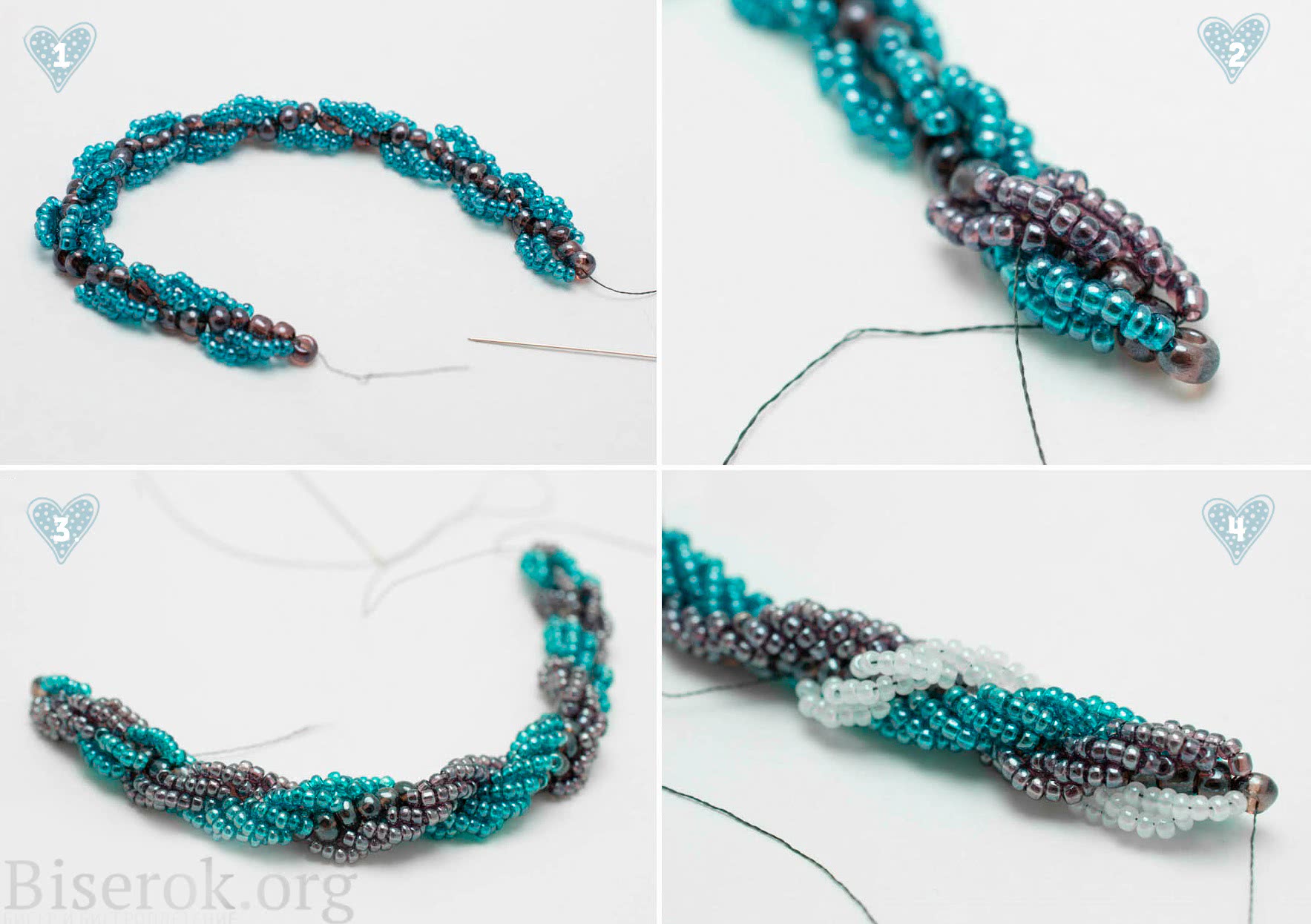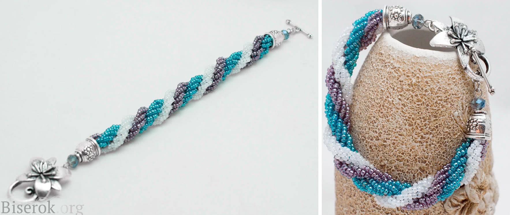 Не менее интересно выглядит жгут, для витков которого выбран бисер разного размера. Если отталкиваться от нашего примера, то можно взять более крупный голубой: он создаст нужный рельеф, и украшение будет смотреться еще выигрышнее.