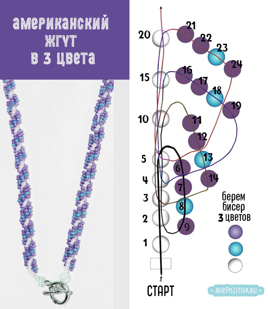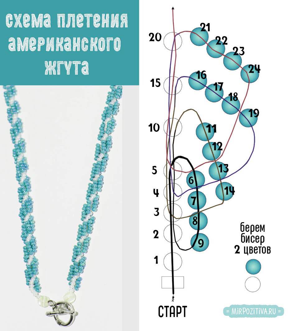 Если вы назовете американский жгут ажурным — не ошибетесь: простая в исполнении техника позволяет получить оригинальное украшение с рельефной поверхностью. Предлагаем вам создать такой двухцветный жгутик по схемам из приведенного здесь МК.