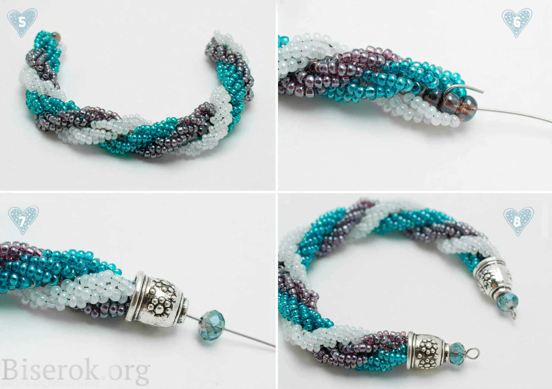 Петелька для фиксации кончика браслета набирается из бисера с торцевой стороны украшения. Понадобятся около 20 бисеринок. А крупная бусина для застежки прикрепляется к другой стороне жгута. Перед тем, как закончить работу, проверьте надежна ли застежка, возможно петельку придется удлинить или укоротить.
