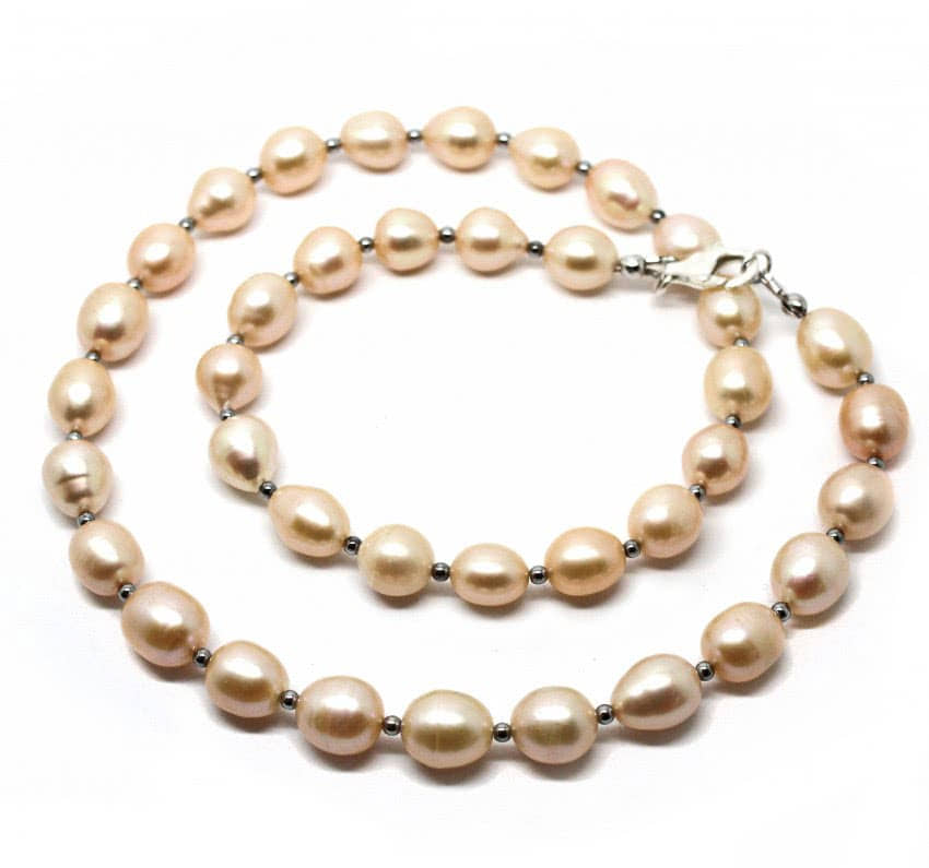 - Нанизать на леску розовый бисер и полученные цветы таким образом: бисер 1 см, цветок, затем снова бисер 1 см и снова цветок (в идеале длина колье должна быть 20-25 см).