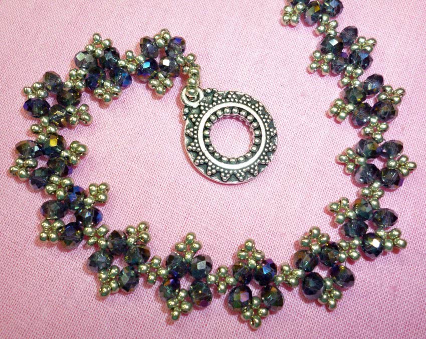 Используя данную технику можно создать не только браслет, но и ободок или чокер. Все это может стать комплектом, или самостоятельным украшением. Для браслета вам понадобится лента, длиной соответствующей обхвату запястья, материал для украшения (бисер, бусины или стразы, можно все вместе). Два зажима для краев. Замок и прочные нитки ( капрон или для вышивания бисером). Также плоскогубцы, ножницы и игла.