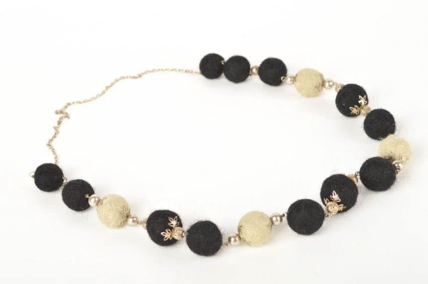 Необычный воротник из фетра, расшитый бусинами, пуговицами и декорированный цепочками выглядит оригинально. Такое украшение из ткани совершенно точно не останется без внимания.
