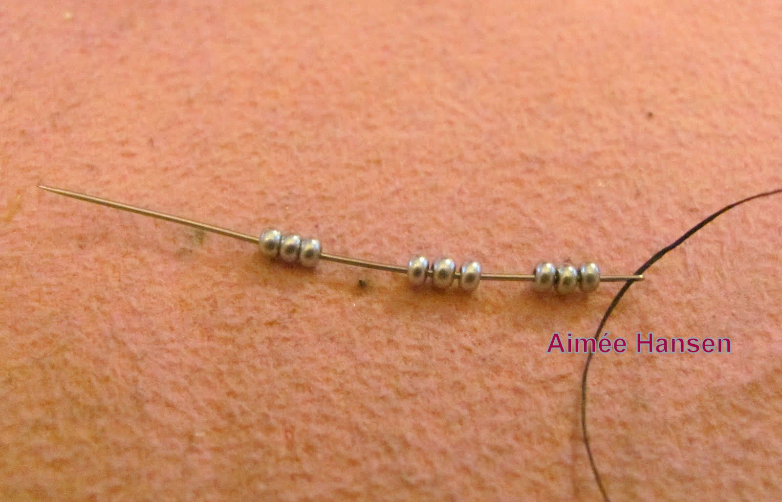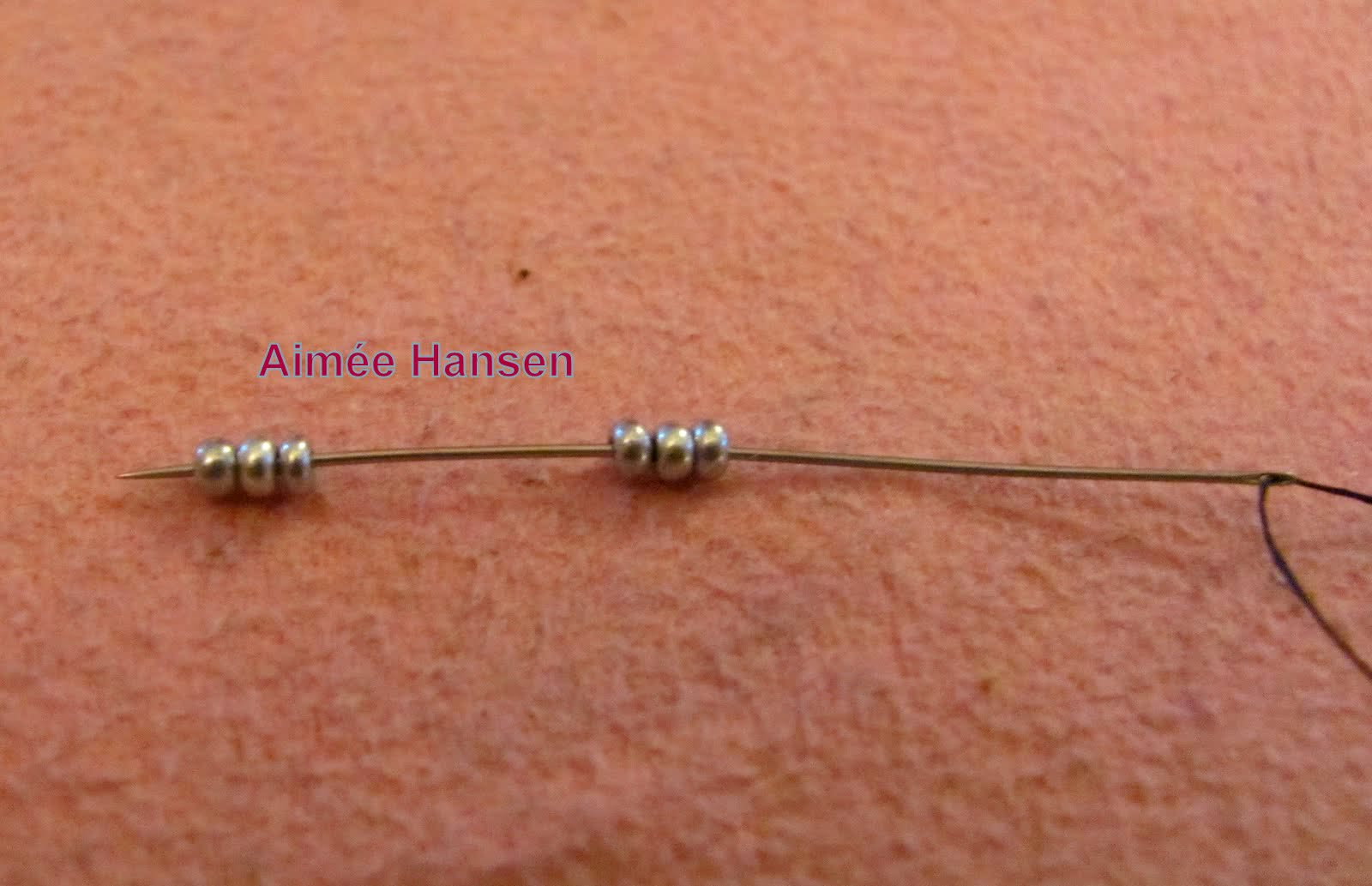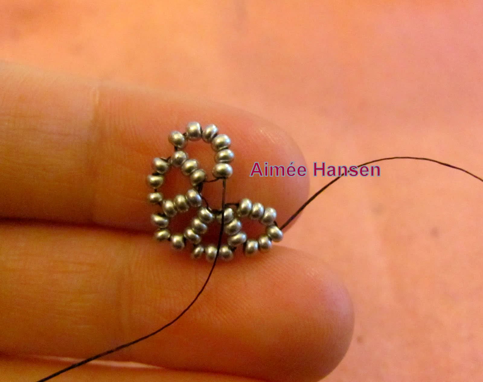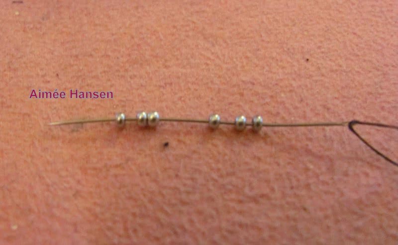 - На один конец нанизать три бисерины фонового цвета. Противоположный конец продеть в две крайние, как на встречу первому концу, после чего затянуть узелок.