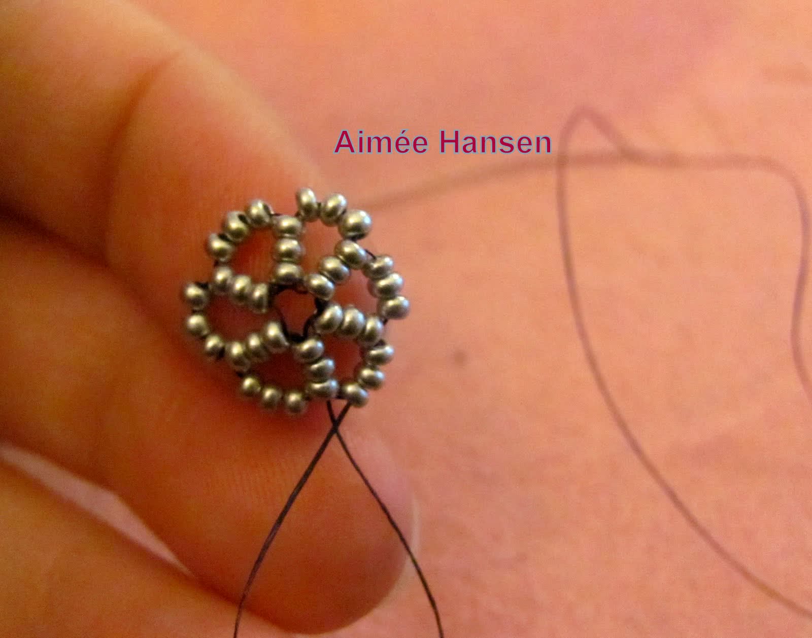 Таким образом мы формируем 5 лепестков. Для шестого последнего лепестка нить должна выходить из тройки бисерин последнего лепестка так, как показано на фотографии. Нанизываем на нее еще три бисерины и отправляем в тройку бисерин следующего лепестка (его мы делали первым).