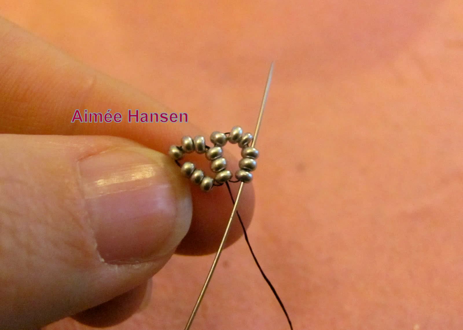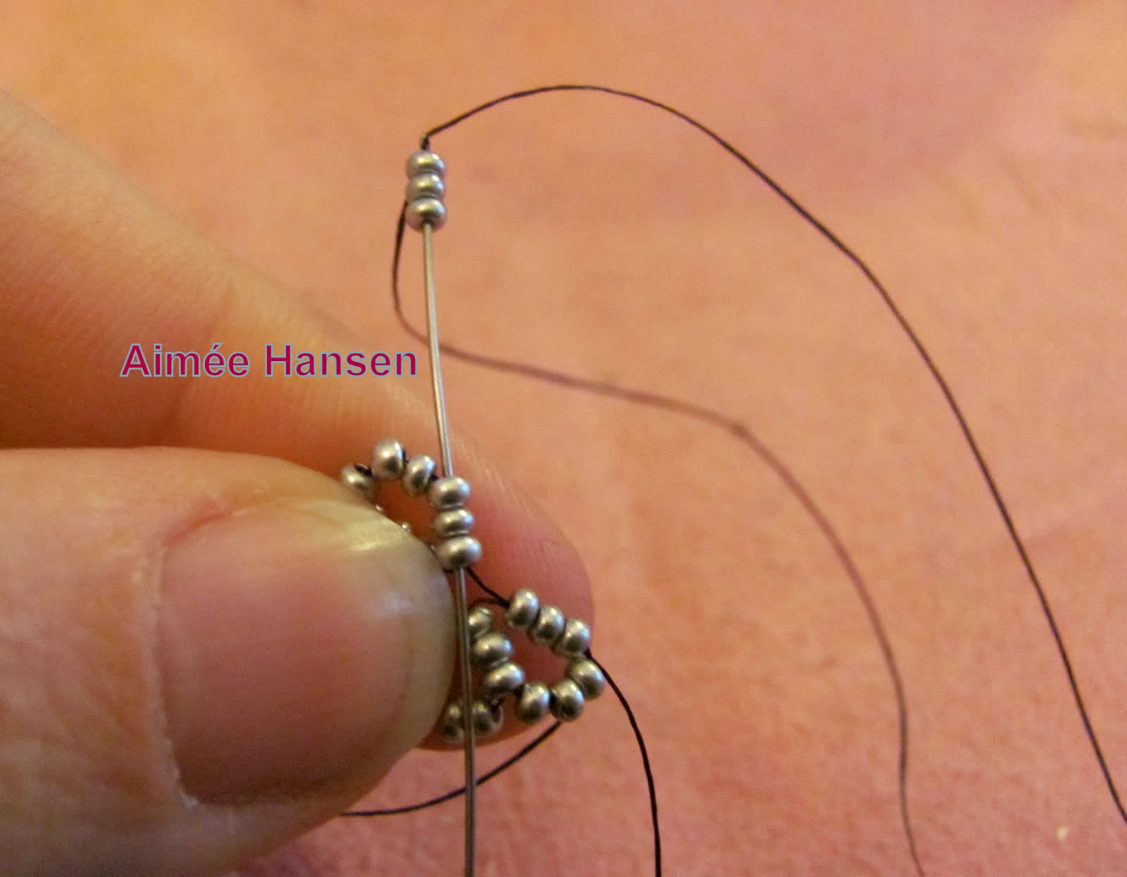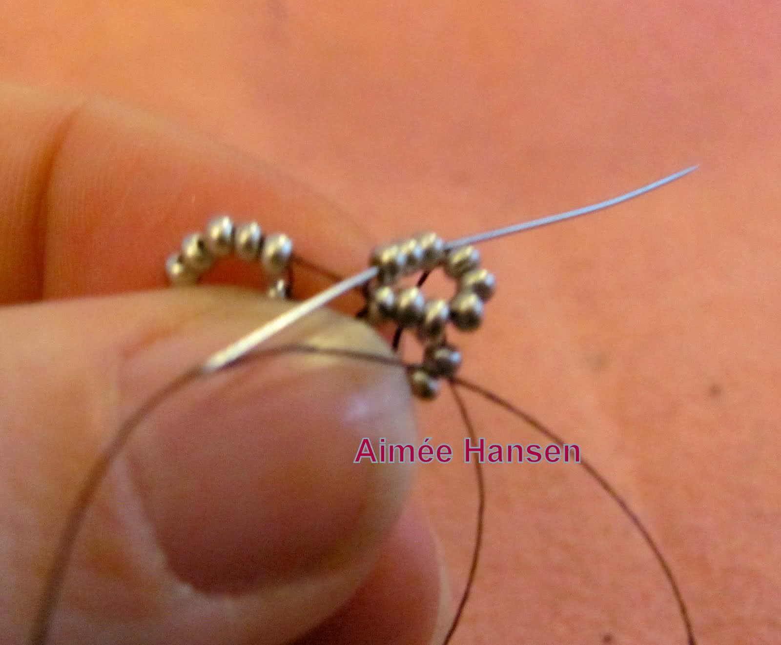 Добавляем еще 6 бисерин, и проходим иголкой через тройку бисерин предыдущего ряда (мы ее не использовали для формирования первого круга). Снова проходим через тройку бисерин, только что добавленного ряда.