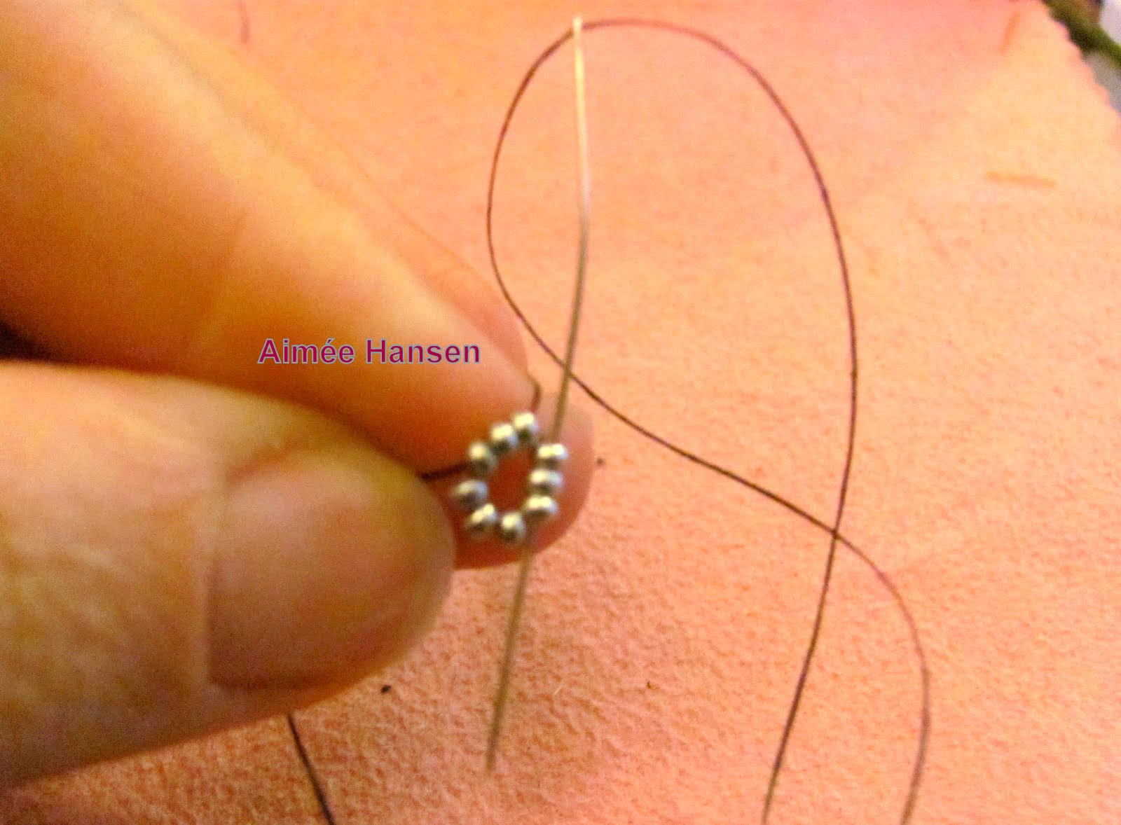 - Колечко фиксируется на основе. Игла при этом выходит на том же месте, где был старт фиксации нити.