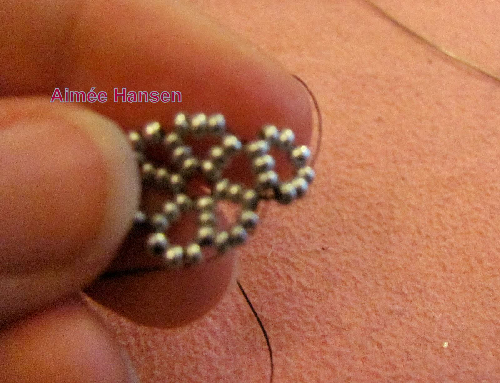- Нанизать три бисерины, продеть в них другой конец, затянуть. То же самое проделать для 4, 5 и более бисерин, пока браслет не достигнет нужной ширины.