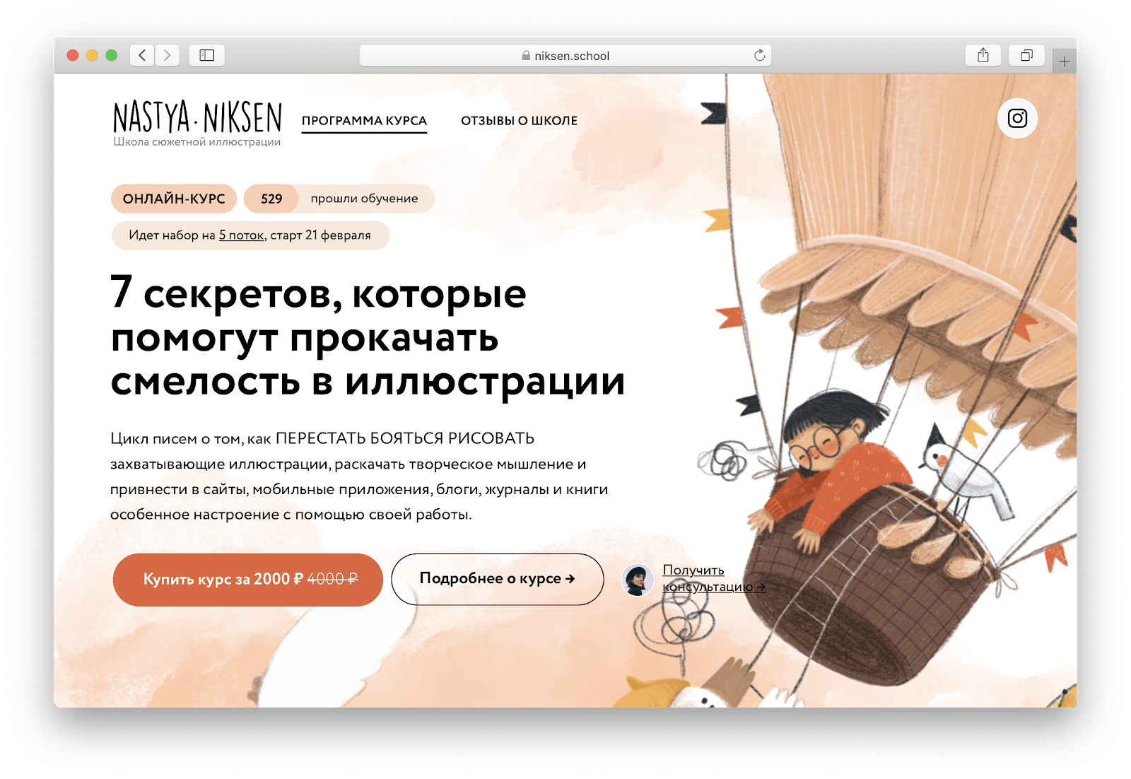 Автор курса: Настя Никсен, иллюстратор и бренд-дизайнер. С детства увлекалась иллюстрацией. Создает коммерческие иллюстрации для мобильных приложений, сайтов, блогов и веб-приложений. Ищите в Instagram под ником @nastyniksen.