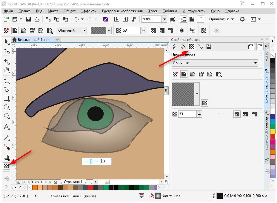 — Прозрачность. Подберите тип прозрачности для объекта. Она может однородной или градиентной. С помощью ползунка задайте ее степень. Прозрачность можно быстро активировать с панели инструментов (см. скриншот).