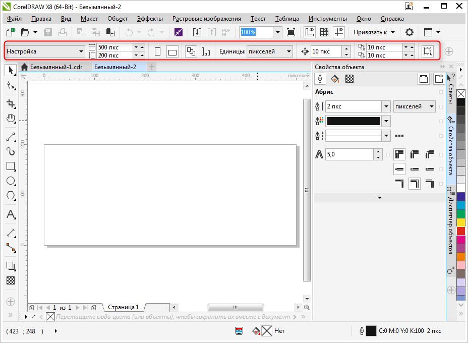 1. В стартовом окне нажмите «Создать» или примените комбинацию клавиш Ctrl + N. Задайте парметры документу: имя, ориентацию листа размер в пикселях или метрических единицах, количество страниц, разрешение, цветовые профили. Нажмите «ОК».