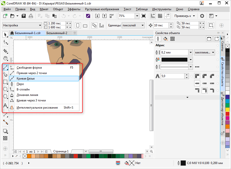 Начните рисовать, используя панель инструментов. На ней находятся инструменты рисования произвольных линий, кривых Безье, полигональных контуров, многоугольников.