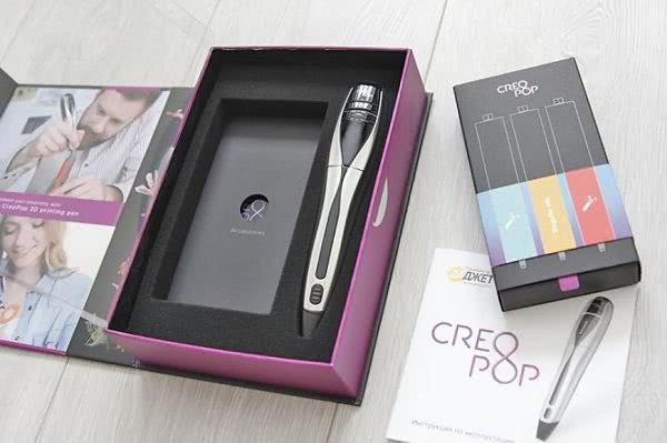 Creopop. Данный девайс использует метод холодной экструзии в своей работе. В качестве расходника приобретается фотополимер, который заправляется в специальный картридж и затвердевает под ультрафиолетом. Основным преимуществом модели является отсутствие провода, поскольку устройство работает от аккумулятора и заряжается путем подключения через порт MicroUSB. О разряде подскажет специальный индикатор, расположенный в верхней части гаджета. Несмотря на свои размеры, устройство обладает сравнительно малым весом. Корпус выполнен с учетом эргономики, что гарантирует комфорт при работе с моделью. Гаджет работает в нескольких режимах, позволяющих лучше приспособится под используемый фотополимер.