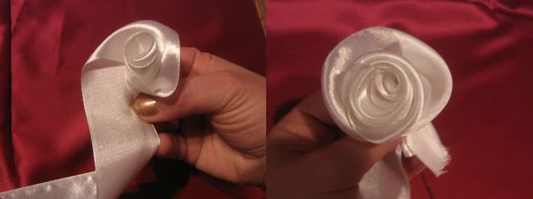 Вторая вариация – это, так называемая, крученая роза. Начало этого способа чем-то напоминает предыдущее, но после окончания формирования центра необходимо поворачивать ленточку тем самым закручивая ее слой за слоем. Когда работа будет закончена, готовое изделие необходимо закрепить.