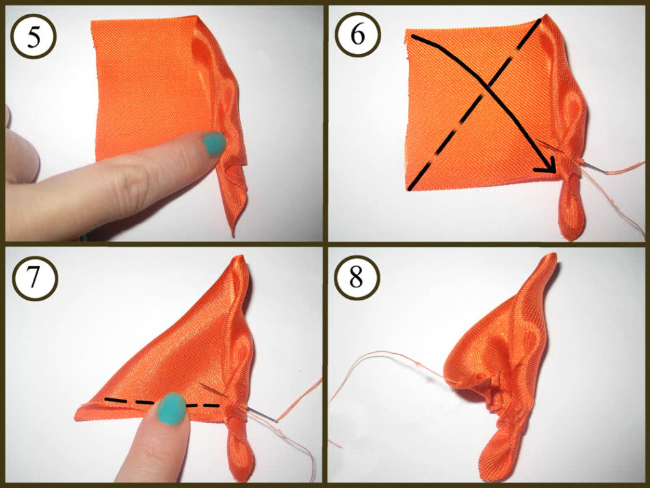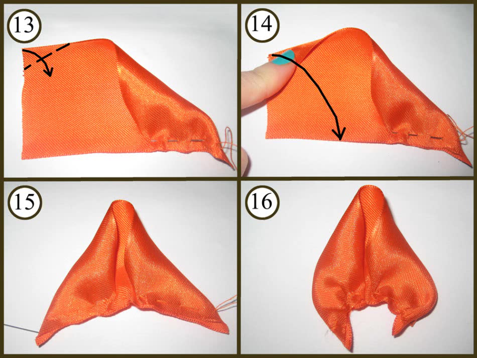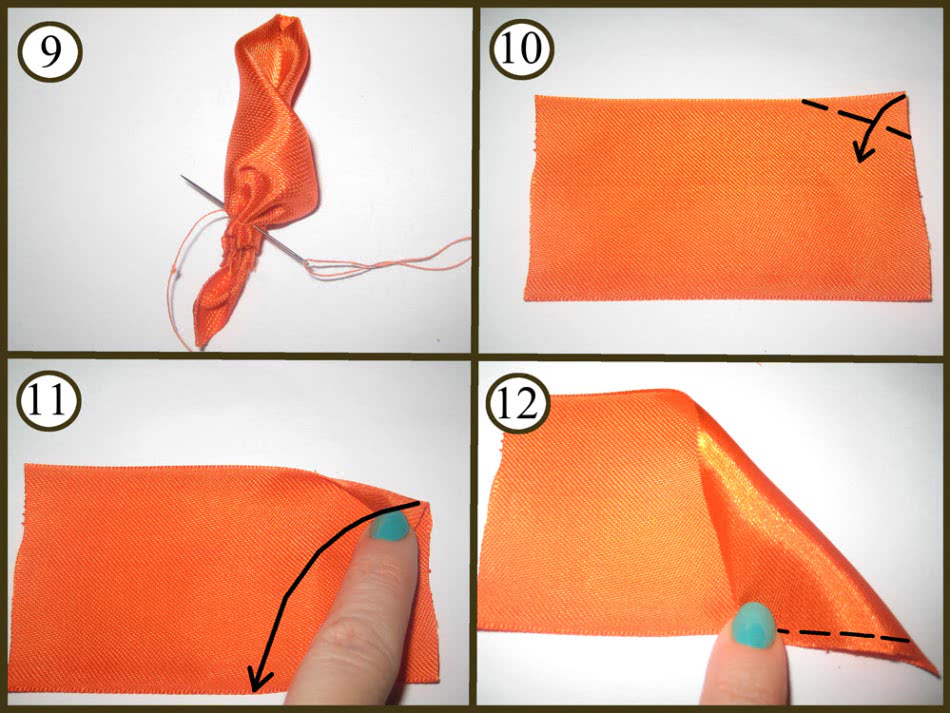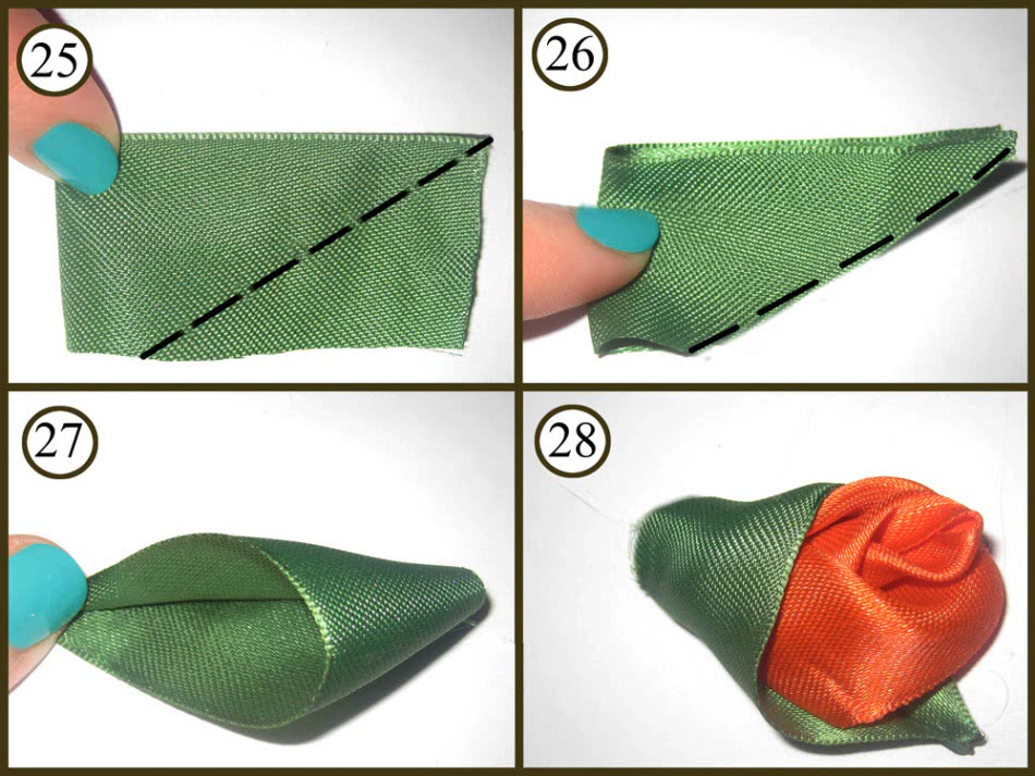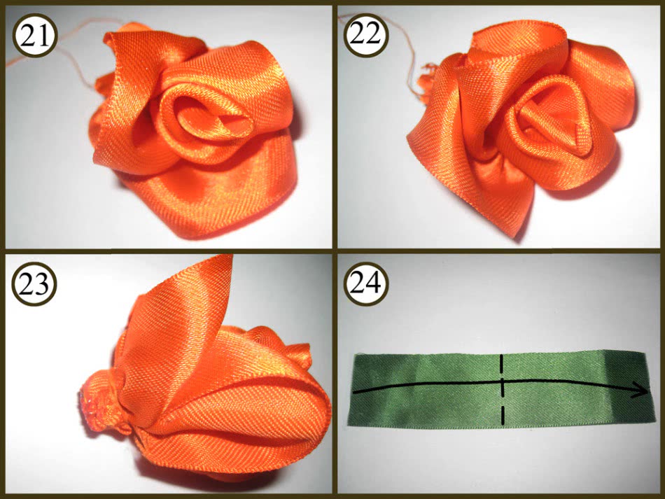 Сшейте оставшиеся ряды лепестков и соедините их в единый цветок. Чтобы сделать листья, возьмите примерно 10 см зелёной ленты и обожгите её концы, чтобы она не распадалась. Уголки сложите к середине, и снизу прошейте намёточным швом. Теперь стяните нитку, чтобы кончики листочка соединились. Потайным швом можно сшить торчащие концы ленты. Листочек готов.