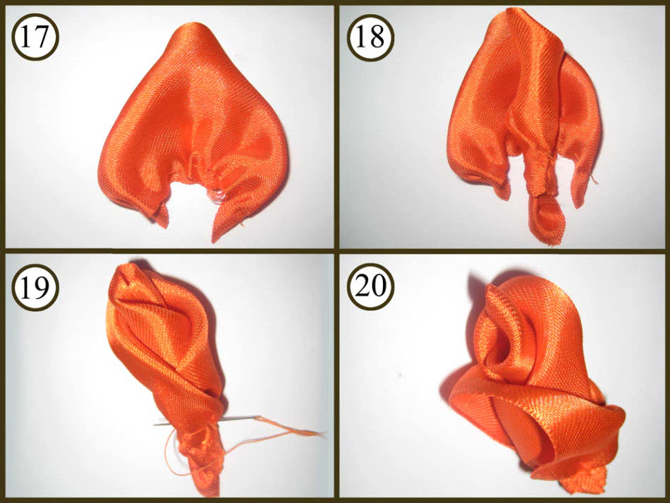 - Край ленты загните под острым углом, оберните конец вокруг сформировавшегося бутона. Это позволяет получить объемные и красивые лепестки. Чтобы роза получилась аккуратной, сворачиваемую ленту после каждых 5-6 оборотов прошивают.