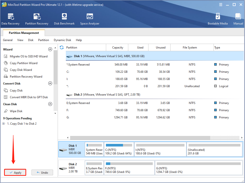 Шаг 6 : Прочтите примечание о том, как загрузиться с нового диска и нажмите Конец кнопка. Когда вы вернетесь в основной интерфейс, нажмите Применять кнопку, чтобы выполнить все отложенные операции.