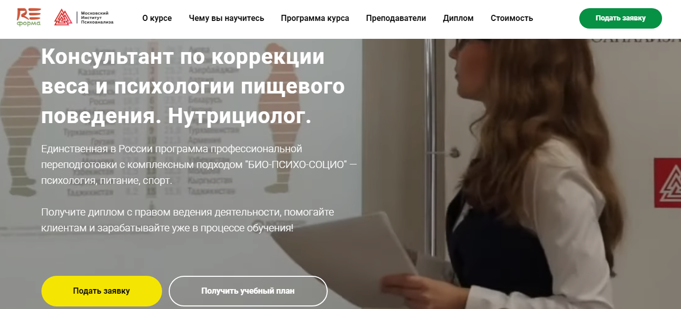 Преимущества: 70 процентов практики и дипломная работа по окончании. Курсы ведут клинический психолог Ольга Кузнецова, психотерапевт-нарколог Дмитрий Марухленко. По окончании курса выдается диплом о переподготовке с правом ведения деятельности в сфере психологии пищевого поведения и коррекции веса.