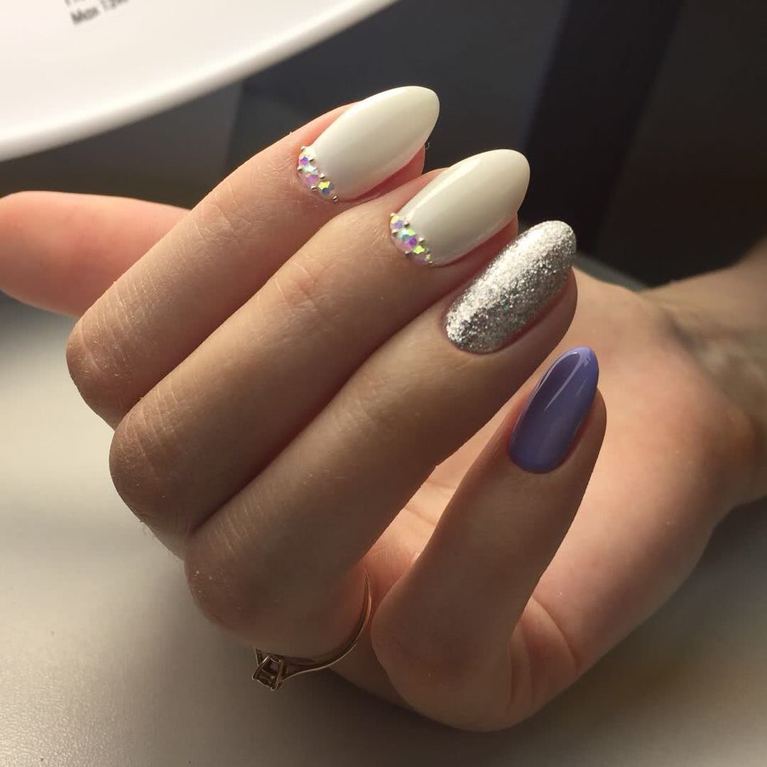 Среди идей дизайна ногтей акриловыми красками пошагово для начинающих можно выбрать и такое решение: ногтевую пластину покройте матовым лаком нужного вам цвета, после полного высыхания основы проведите две белые ассиметричные линии, пересекающиеся между собой, по направлению от верхнего края к нижнему. Точку пересечения украсьте с помощью страз, закрепите финишным покрытием.