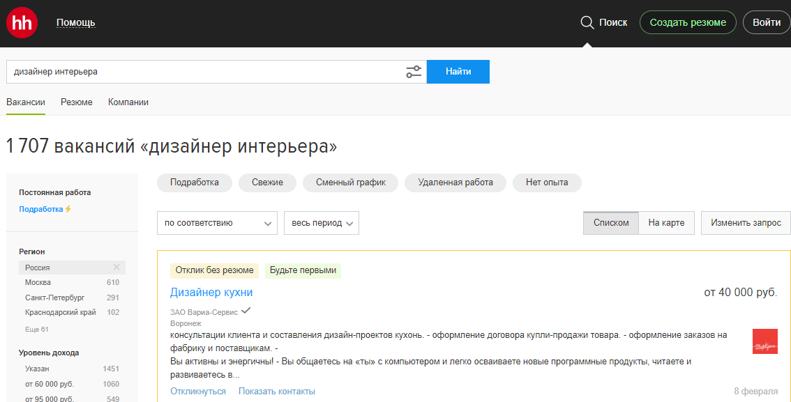 Если вы сегодня заглянете на HeadHunter, то найдете примерно 1 700 вакансий в России для дизайнеров интерьера.