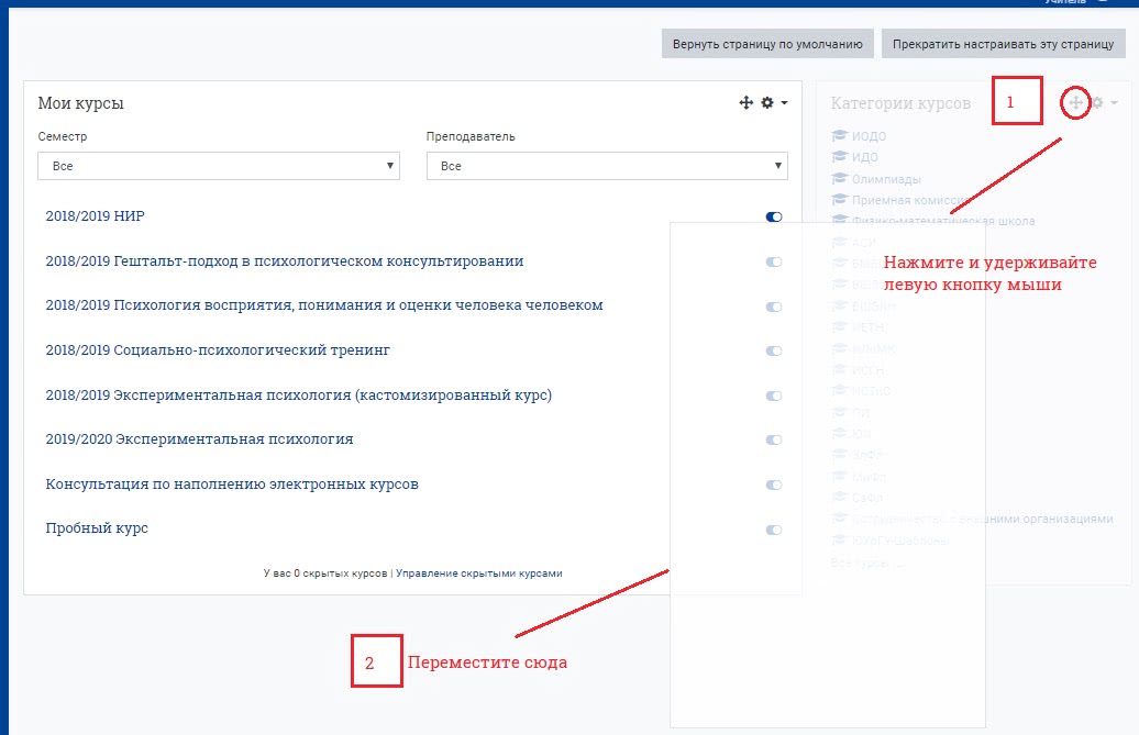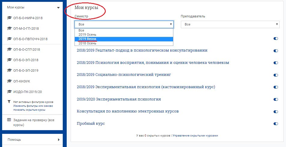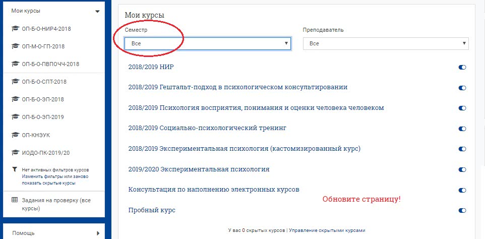 Чтобы настроить отображение курсов за текущий семестр, перейдите на страницу личного кабинета, в блоке «Мои курсы» в выпадающем меню «Семестр» выберите нужный семестр. Обновите страницу.