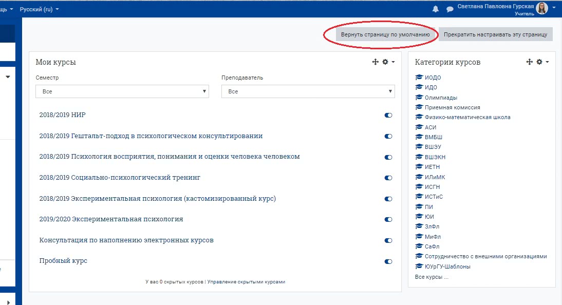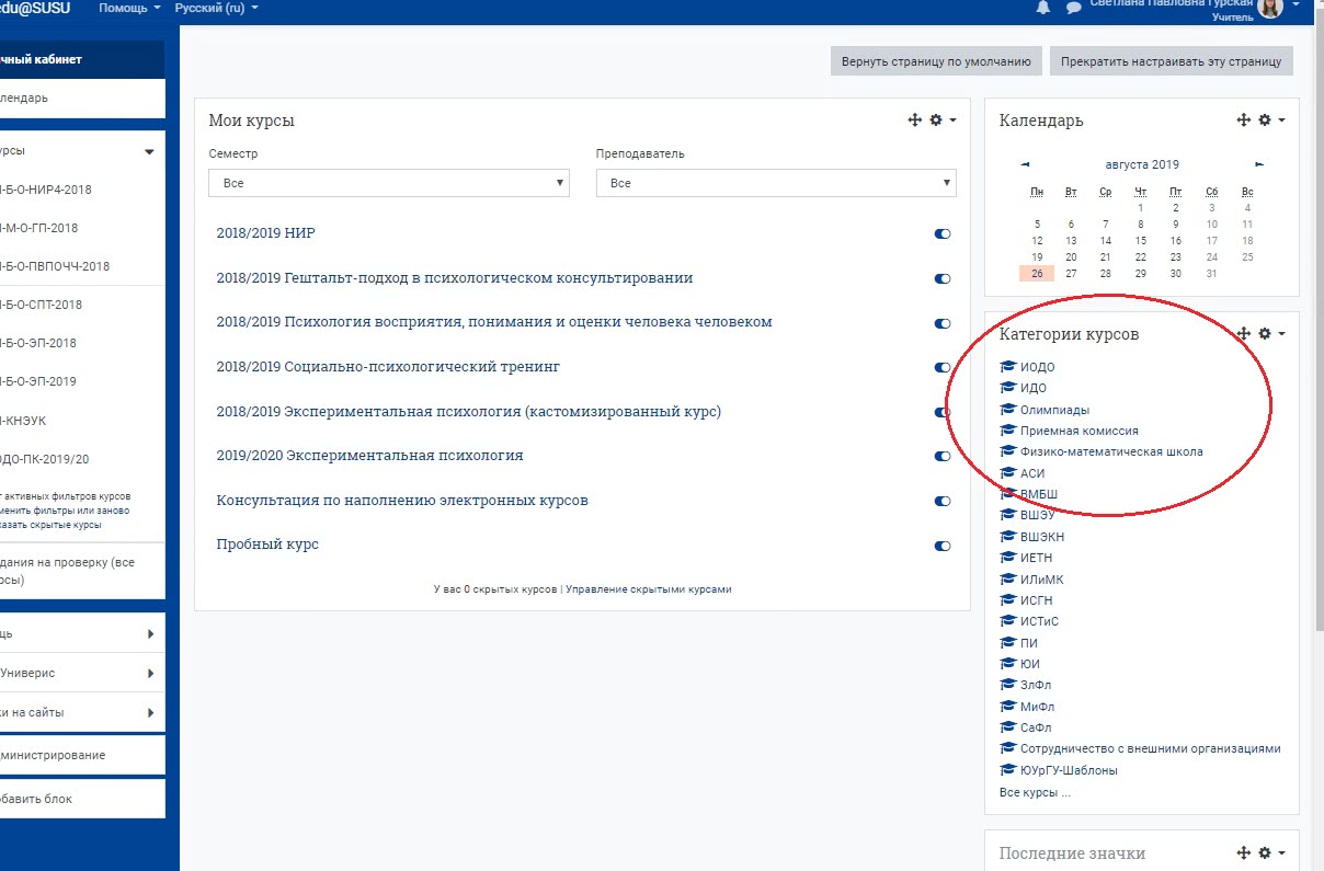 - Блок «Мои курсы» и на странице личного кабинета, и в левой панели управления по умолчанию показывает все ваши курсы за все годы работы в Электронном ЮУрГУ.