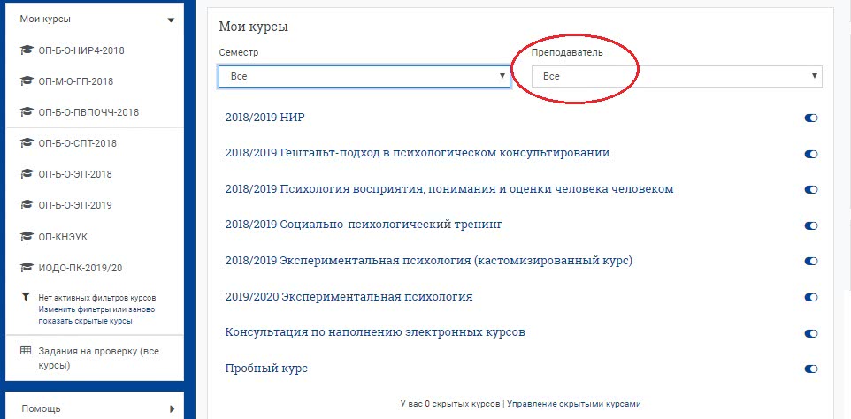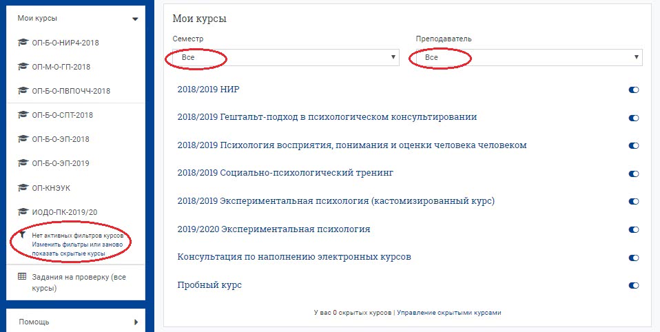 На это указывает подсказка в левой панели под списком курсов: «Нет активных фильтров курсов». А также — слово «Все» в выпадающих списках «Семестр» и «Преподаватель» в блоке «Мои курсы» на странице личного кабинета.