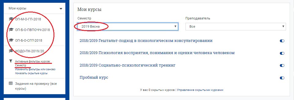 После этого вы увидите, что и на странице личного кабинета, и в левой панели отображаются только те курсы, которые идут в выбранном вами семестре. В левой панели под списком курса появляется подсказка: «Активные фильты курсов: Семестр».