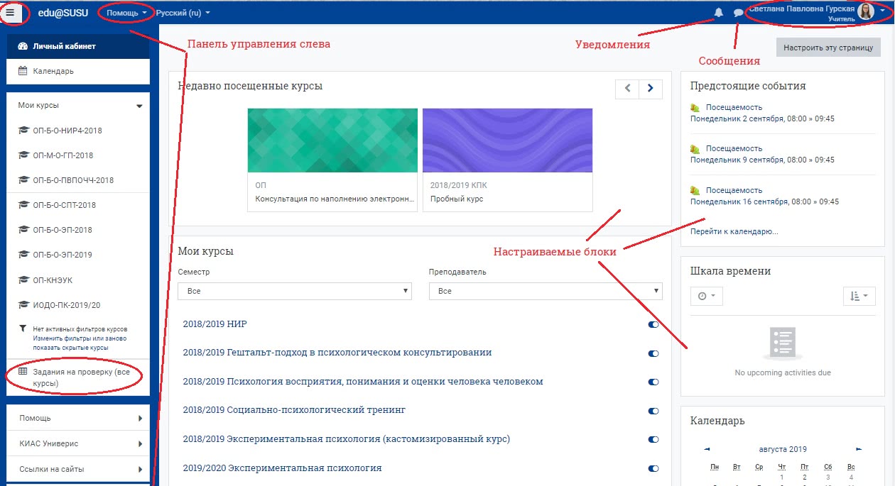 - Сверху расположено выпадающее меню «Помощь», в котором находится ссылка на инструкции для преподавателя по работе в учебном портале;